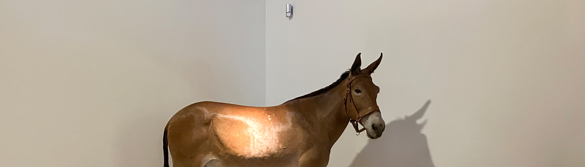 Wir stellen vor: Renate, ein Maultierpräparat, das uns freundlicherweise das Bayerische Armeemuseum in Ingolstadt als Leihgabe zur Verfügung stellt. Am letzten Freitag verließ Renate ihren heimatlichen Stall im Reduit Tilly, wurde mit Unterstützung der Kolleg:innen vom Armeemuseum auf einen 7,5-Tonner geladen und wohlbehalten ins 10 Kilometer entfernte Manching transportiert. Im kelten römer museum überwand das Muli die letzten Hindernisse an Türen und Fahrstuhl und bezog sein neues Domizil in der Ausstellung »Roms Armee im Feld«.