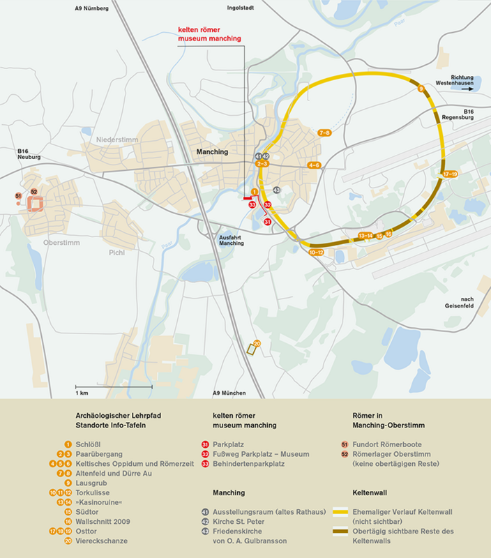 Unser Lehrpfad führt Sie auf einer Entdeckungstour zu Orten von besonderer archäologisch-historischer Bedeutung in Manching und dessen unmittelbarer Umgebung. Hierzu zählen wichtige Fund- und Ausgrabungsstätten, obertägig sichtbare Reste antiker Baustrukturen und die lebensgroße Kulisse eines Tores mit sogenannter Pfostenschlitzmauer. An 11 Standorten mit insgesamt 20 Info-Tafeln lässt sich die reiche keltische Vergangenheit im Gelände anschaulich erkunden.
