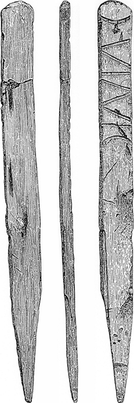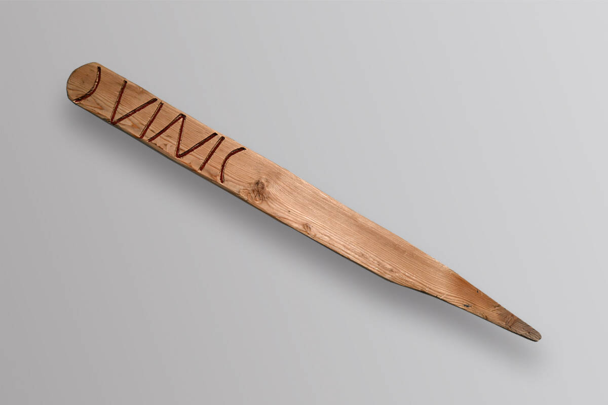 In die Holzlatte ist eine lateinische Inschrift eingeschnitzt: Oben lässt sich zunächst ein spiegelverkehrtes »C« erkennen, kurz für C(enturia), also eine Abteilung von 80 Legionären. Es folgt der abgekürzte Name des Vinicius, wohl im Genitiv: VINIC(ii). In der römischen Armee war es gängiger Brauch, dass Truppeneinheiten den Namen ihres Offiziers führten, hier also denjenigen des Zenturios Vinicius. Entsprechendes lässt sich auch bei Reiterschwadronen im hiesigen Hilfstruppenkastell von Manching-Oberstimm nachweisen.