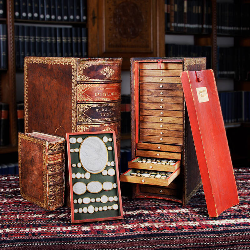 … erwarteten die Schüler des Gymnasiums bei St. Anna in Augsburg, als sie um 1769 die dritte Ausgabe der sogenannten Daktyliothek von Philipp Daniel Lippert (1702–1785) erhielten. Die beiden Schränkchen in Buchform bargen Abdrücke antiker Gemmen aus den wichtigsten Sammlungen Europas. So ließ sich die faszinierende Bilderwelt des klassischen Altertums im praktischen Schubladenformat studieren.
