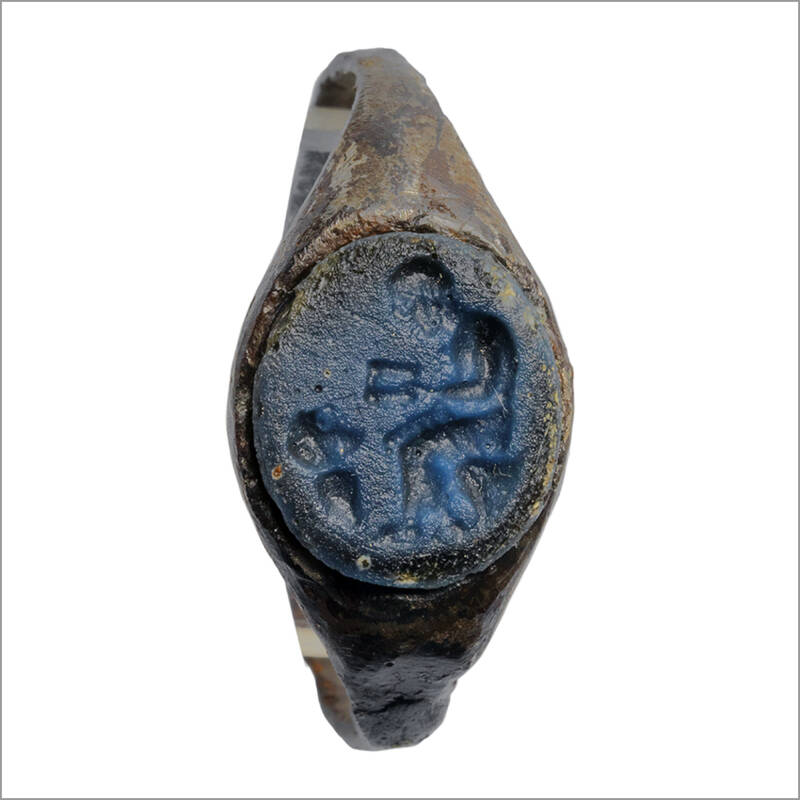 Es handelt sich um eine blaue Glasgemme, die in einen eisernen Fingerring eingelassen ist. Der Ring wurde bei Ausgrabungen im römischen Militärkastell von Oberstimm gefunden und stammt vermutlich – ebenso wie die zugehörige Gemme – aus der Zeit um Christi Geburt.