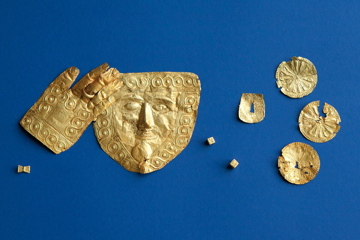 Dem Verstorbenen, einem jugendlichen Mann, hatte man kostbare Gegenstände mit ins Jenseits gegeben, darunter goldene Spielwürfel, ein Paar Sandalen und ein Wagenmodell aus Silber, bronzene Gefäße und eiserne Waffen. Besondere Highlights bildeten eine Totenmaske und eine Hand mit aufgestecktem Fingerring – alles aus Gold gefertigt.